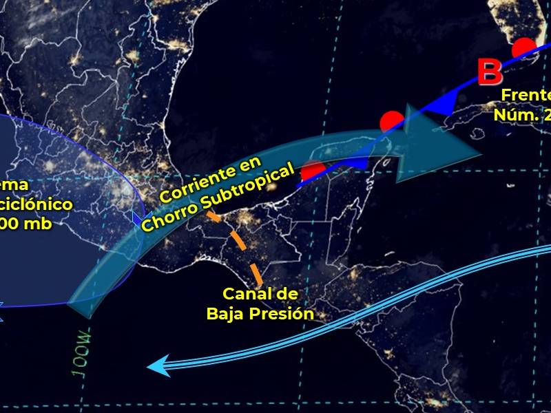 Por otra parte, el frente frío Núm. 30 se desplazará sobre el noroeste del país y gradualmente sobre el norte de la República Mexicana, continuará interaccionando con una vaguada polar y con la corriente en chorro polar, así como con una línea seca sobre Coahuila, produciendo rachas fuertes de viento de hasta 80 km/h con tolvaneras en la Península de Baja California, noroeste de México y entidades de la Mesa del norte. A su vez, se prevé viento de componente sur con rachas de hasta 70 km/h en el noreste del territorio nacional y viento de componente norte con rachas de hasta 80 km/h y oleaje de 2 a 4 metros de altura en la costa oeste de la Península de Baja California. Finalmente, una circulación anticiclónica en niveles medios de la atmósfera mantendrá tiempo estable y baja probabilidad de lluvia sobre el occidente, centro y sur de México.