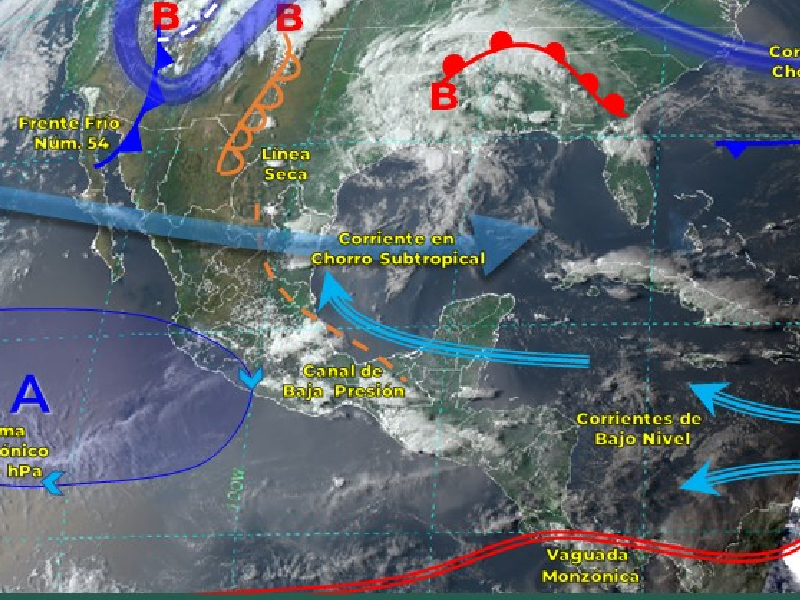 El frente frío Núm. 54 interaccionará con una línea seca sobre el norte de México, mantendrá los vientos con rachas fuertes y tolvaneras en dicha región, además de chubascos y lluvias puntuales fuertes acompañadas de descargas eléctricas en Coahuila, Nuevo León y Tamaulipas. Por otra parte, un canal de baja presión se extenderá desde el centro y oriente del territorio nacional, en combinación con la entrada de humedad del Océano Pacífico y Golfo de México, provocarán chubascos y lluvias fuertes acompañadas de descargas eléctricas en el oriente, centro, sur y sureste de la República Mexicana, incluido el Valle de México, pronosticándose lluvias puntuales muy fuertes en Oaxaca y Chiapas. Finalmente, continuará la segunda onda de calor sobre el pacífico mexicano, el noreste, oriente y sureste de la República Mexicana, incluida la Península de Yucatán, con temperaturas máximas por arriba de los 40 °C en zonas de Tamaulipas, San Luis Potosí, Sinaloa, Nayarit, Jalisco, Colima, Michoacán, Guerrero, Oaxaca, Chiapas, Veracruz, Tabasco, Campeche y Yucatán.