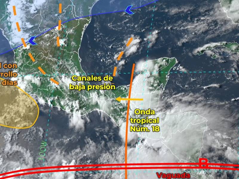 La onda tropical Núm. 18 se desplazará lentamente sobre el oriente y sureste del territorio nacional, manteniendo las condiciones para lluvias muy fuertes a intensas en ambas regiones, las cuales podrían incrementar los niveles de ríos, arroyos y provocar deslaves e inundaciones.
