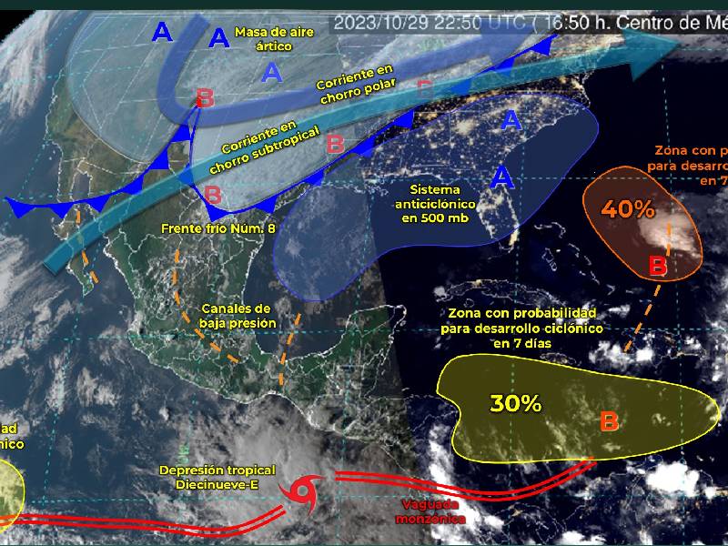 El frente frío Núm. 8 recorrerá rápidamente el litoral del Golfo de México, al llegar al sureste mexicano interaccionará con la extensa circulación de la posible tormenta tropical Pilar, la cual se localizará al sur de las costas de Chiapas, originando lluvias de fuertes a muy fuertes sobre estados del norte, noreste, oriente y sur del territorio nacional, con puntuales intensas en Tamaulipas, San Luis Potosí, Guerrero y Oaxaca, y puntuales torrenciales en Puebla, Veracruz, Chiapas y Tabasco. Por su parte, la masa de aire ártico asociada al frente, ocasionará ambiente diurno frío a fresco y ambiente matutino y nocturno frío a muy frío sobre la mayor parte de la República Mexicana, evento de “Norte” con rachas de 100 a 120 km/h y posible formación de trombas marinas con oleaje de 3 a 5 metros de altura en las costas de Tamaulipas, Veracruz, Istmo y Golfo de Tehuantepec, además de rachas de 50 a 70 km/h en Tabasco y la Península de Yucatán. También, se pronostican fuertes rachas de viento y posibles tolvaneras en Baja California, Sonora, Nuevo León, Zacatecas y San Luis Potosí. Asimismo, existirán condiciones para la caída de aguanieve o nieve en sierras de Chihuahua, Coahuila, Nuevo León y en las cimas montañosas superiores a 4,200 metros sobre el nivel del mar del centro y oriente del país (Citlaltépetl, Popocatépetl, Iztaccíhuatl, Nevado de Toluca, La Malinche, Sierra Negra y Cofre de Perote). Por otro lado, un canal de baja presión sobre el occidente de la República Mexicana, aunado al ingreso de humedad del Océano Pacífico y Golfo de México e inestabilidad en niveles altos de la atmósfera, propiciará chubascos y lluvias fuertes en esa región.Pronóstico de lluvias para el 30 de octubre de 2023:Lluvias intensas con puntuales torrenciales (150 a 250 mm): Puebla, Veracruz, Chiapas y Tabasco. Lluvias muy fuertes con puntuales intensas (75 a 150 mm): Tamaulipas, San Luis Potosí, Guerrero y Oaxaca. Lluvias fuertes con puntuales muy fuertes (50 a 75 mm): Hidalgo y Campeche. Intervalos de chubascos con lluvias puntuales fuertes (25 a 50 mm): Chihuahua, Durango, Coahuila, Nuevo León, Zacatecas, Nayarit, Jalisco, Colima, Michoacán, Querétaro, Yucatán y Quintana Roo. Intervalos de chubascos (5 a 25 mm): Aguascalientes, Guanajuato, Estado de México y Tlaxcala. Lluvias aisladas (0.1 a 5 mm): Morelos.Probabilidad de caída de aguanieve o nieve: zonas montañosas de Chihuahua, Coahuila y Nuevo León. Probabilidad de caída de aguanieve o nieve en cimas montañosas superiores a 4200 metros sobre el nivel del mar del centro y oriente del país: Citlaltépetl, Popocatépetl, Iztaccíhuatl, Nevado de Toluca, La Malinche, Sierra Negra y Cofre de Perote.Las lluvias fuertes a torrenciales estarán acompañadas con rachas de viento, descargas eléctricas y posible caída de granizo; además, las lluvias fuertes a intensas podrían originar visibilidad reducida, deslaves, encharcamientos o inundaciones, así como incremento en los niveles de ríos y arroyosPronóstico de temperaturas máximas para el 30 de octubre de 2023:Temperaturas máximas de 35 a 40 °C: Campeche, Yucatán y Quintana Roo.Temperaturas máximas de 30 a 35 °C: Baja California Sur, Sonora (sur), Sinaloa, Nayarit, Jalisco, Colima, Michoacán, Guerrero, Oaxaca y Tabasco.Pronóstico de temperaturas mínimas para la madrugada del 30 de octubre de 2023:Temperaturas mínimas de -10 a -5 °C con heladas: sierras de Chihuahua y Durango. Temperaturas mínimas de -5 a 0 °C con heladas: sierras de Baja California, Sonora y Zacatecas. Temperaturas mínimas de 0 a 5 °C: sierras de Coahuila, Nuevo León, Tamaulipas, Estado de México, Tlaxcala, Puebla, Hidalgo y Veracruz.Pronóstico de viento y oleaje para para el 30 de octubre de 2023:Evento de “Norte” con rachas de 100 a 120 km/h, oleaje de 3 a 5 metros y posible formación de trombas marinas: costas de Tamaulipas y Veracruz, Istmo y Golfo de Tehuantepec; y con rachas de 50 a 70 km/h y oleaje de 1 a 2 metros de altura: Tabasco y Campeche.Viento con rachas de 50 a 70 km/h: Golfo de California; con tolvaneras: Baja California, Sonora, Chihuahua, Durango, Coahuila, Nuevo León, Zacatecas y San Luis Potosí.Península de Yucatán: Cielo medio nublado durante la mañana y nublado hacia la tarde-noche, con lluvias fuertes en Yucatán y Quintana Roo y puntuales muy fuertes en Campeche, dichas lluvias podrían acompañarse de descargas eléctricas. Ambiente cálido por la mañana y caluroso a muy caluroso durante la tarde. Viento del este y noreste de 10 a 20 km/h con rachas de hasta 40 km/h. Evento de “Norte” con rachas de 50 a 70 km/h y oleaje de 1 a 2 metros de altura en costas de Campeche.Con información de: 24 Horas NacionalSíguenos en nuestras redes sociales ??Twitter  Facebook  Instagram