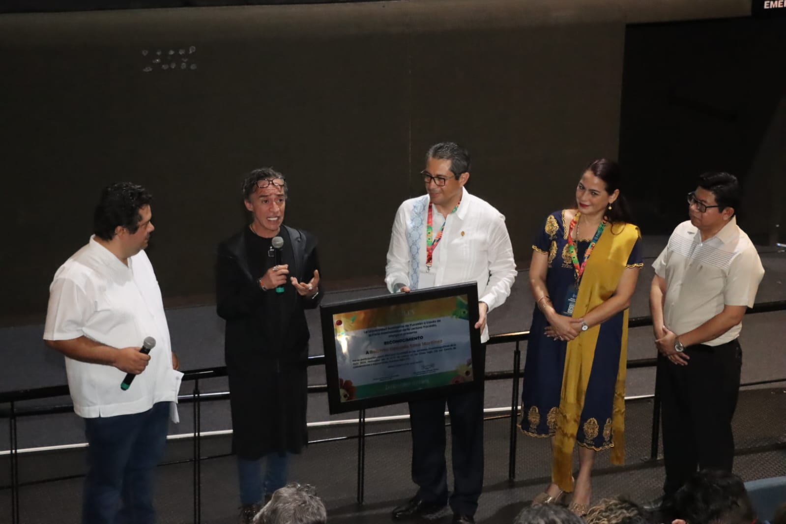 El rector de la UADY, Carlos Alberto Estrada Pinto, y la directora de la FILEY, María Teresa Mézquita Méndez, entregaron el reconocimiento al talentoso actor.