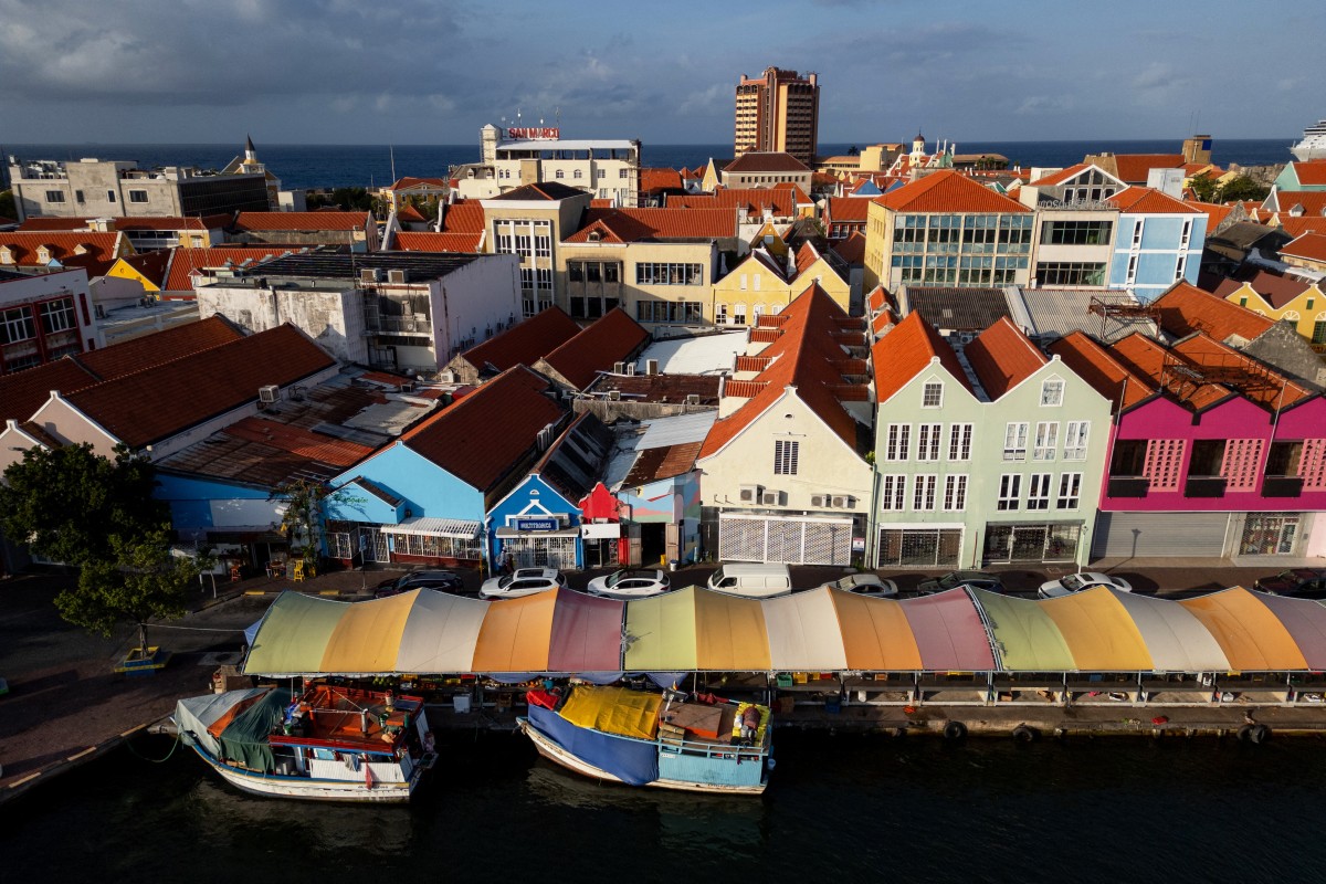 Aerial view of the Punda floating market and colonial buildings on the waterfront of old town Willemstad, Curacao, in the Dutch Caribbean on March 14, 2024. (Photo by Federico PARRA / AFP)