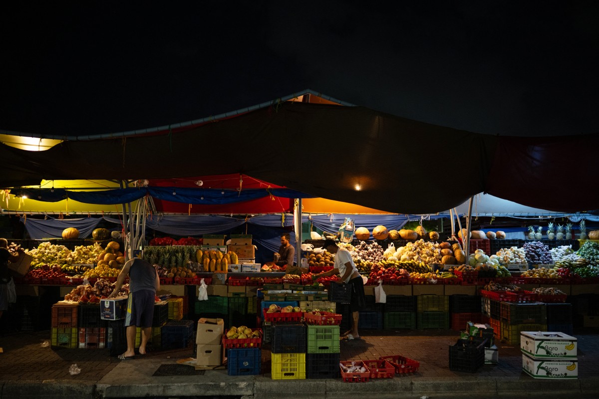 Aún no sale el sol. Se oye una radio de Venezuela: un locutor repasa la actuación de beisbolistas venezolanos en los entrenamientos primaverales de las Grandes Ligas y luego suena el himno nacional. Los Cordero y su tripulación, mientras, ordenan la mercancía antes de abrir.