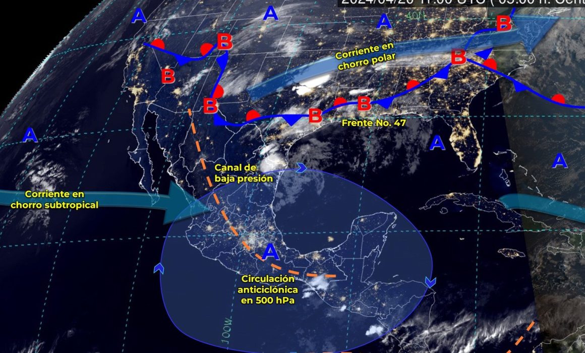 Hoy sábado, la circulación anticiclónica en niveles medios de la atmósfera mantendrá la onda de calor sobre gran parte del territorio nacional, con temperaturas máximas que podrían superar los 45 °C en Michoacán, Guerrero, Oaxaca, Chiapas, Veracruz, Tabasco y Campeche.