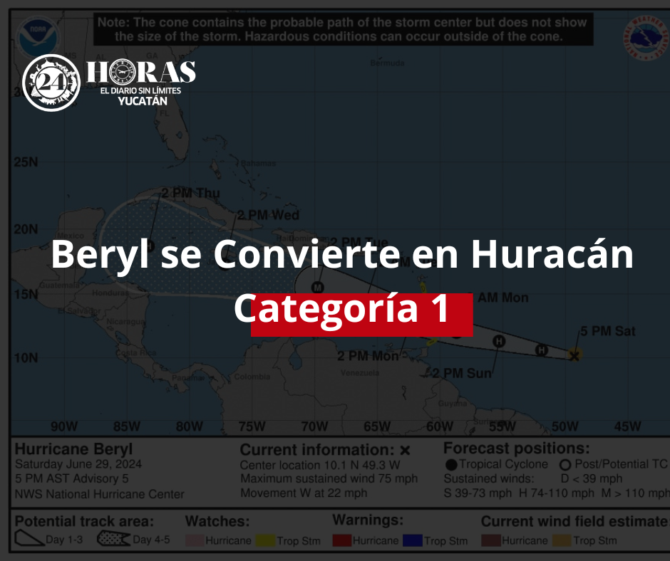 24 Horas Yucatán La tormenta Beryl se ha fortalecido hasta convertirse en un huracán con vientos máximos sostenidos de 120 km/h (75 millas por hora) y ráfagas más fuertes, según la actualización de las 5 p.m. ET del Centro Nacional de Huracanes de EE.UU. (NHC, por sus siglas en inglés). "Beryl ahora es un huracán … Sigue leyendo Beryl se Convierte en Huracán Categoría 1