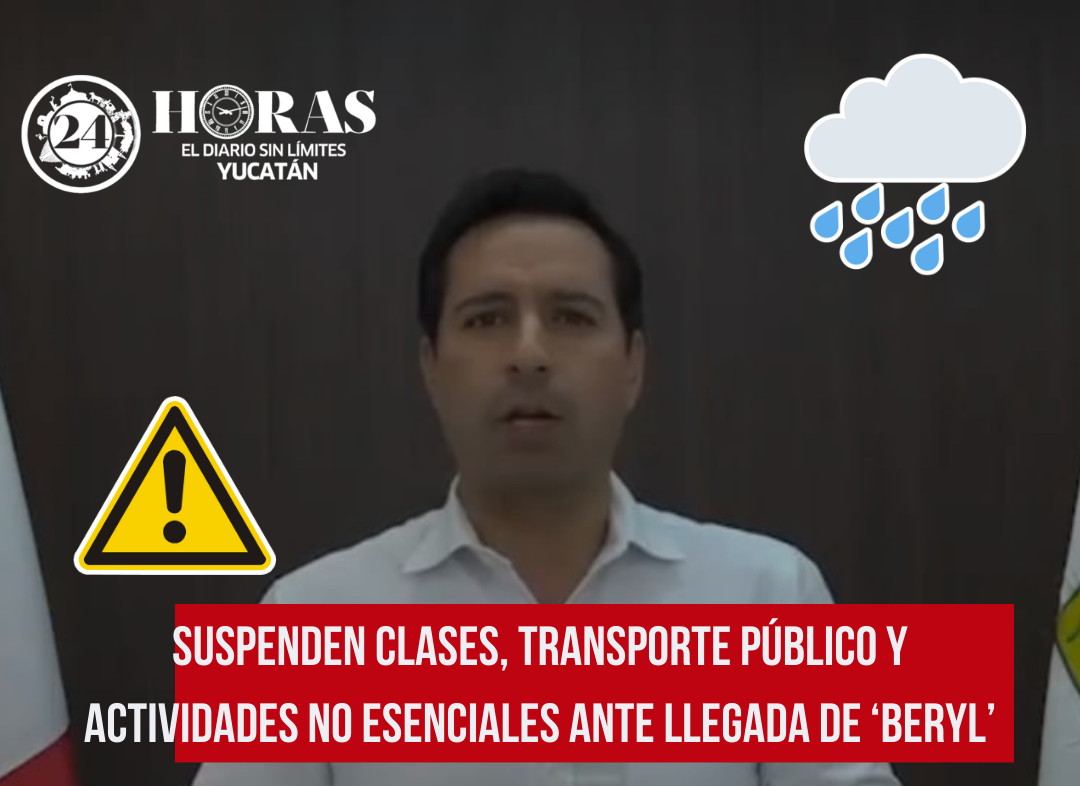 El gobernador Mauricio Vila Dosal anunció, a través de sus redes sociales, nuevas medidas relativas al huracán “Beryl”, el cual, según el Servicio Meteorológico Nacional (SMN) llegará como categoría 1 a Yucatán. Entre estas iniciativas figura la suspensión del transporte público en todo el estado, de las clases y de las actividades no esenciales.