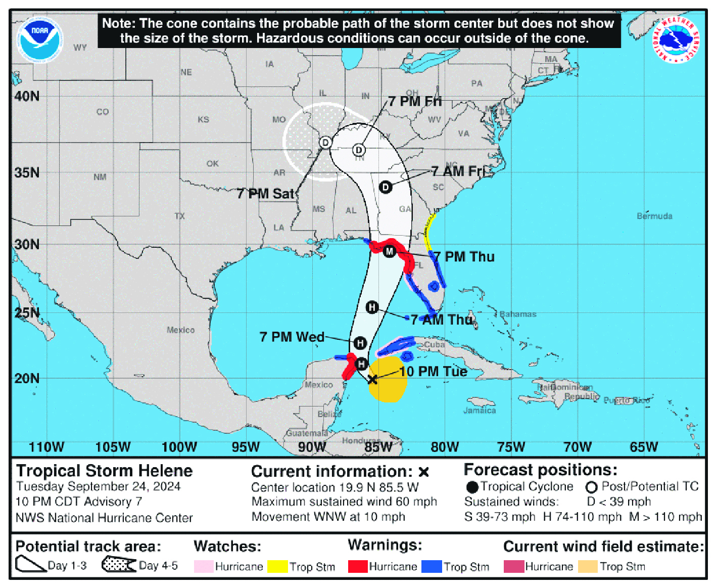 Señaló que se espera que Helene continúe su trayectoria hacia el Golfo de México para dirigirse a Estados Unidos, esto aproximadamente para el jueves. Relató que es probable que impacte la parte noroeste de Florida ya como un huracán mayor, al menos de categoría 3 escala Saffir-Simpson.