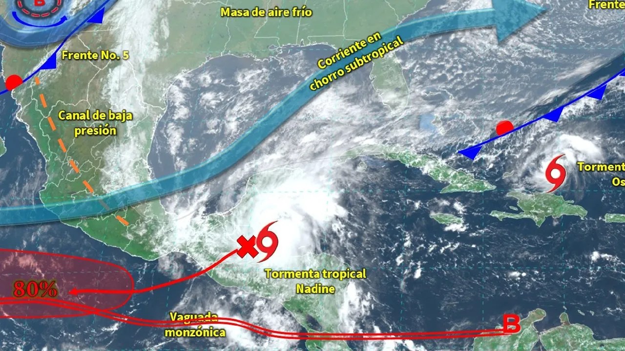 El temporal de lluvias continuará en la región debido a la interacción de la tormenta tropical Nadine con el sistema frontal No. 4, que se mantiene estacionario en el norte de la península de Yucatán.