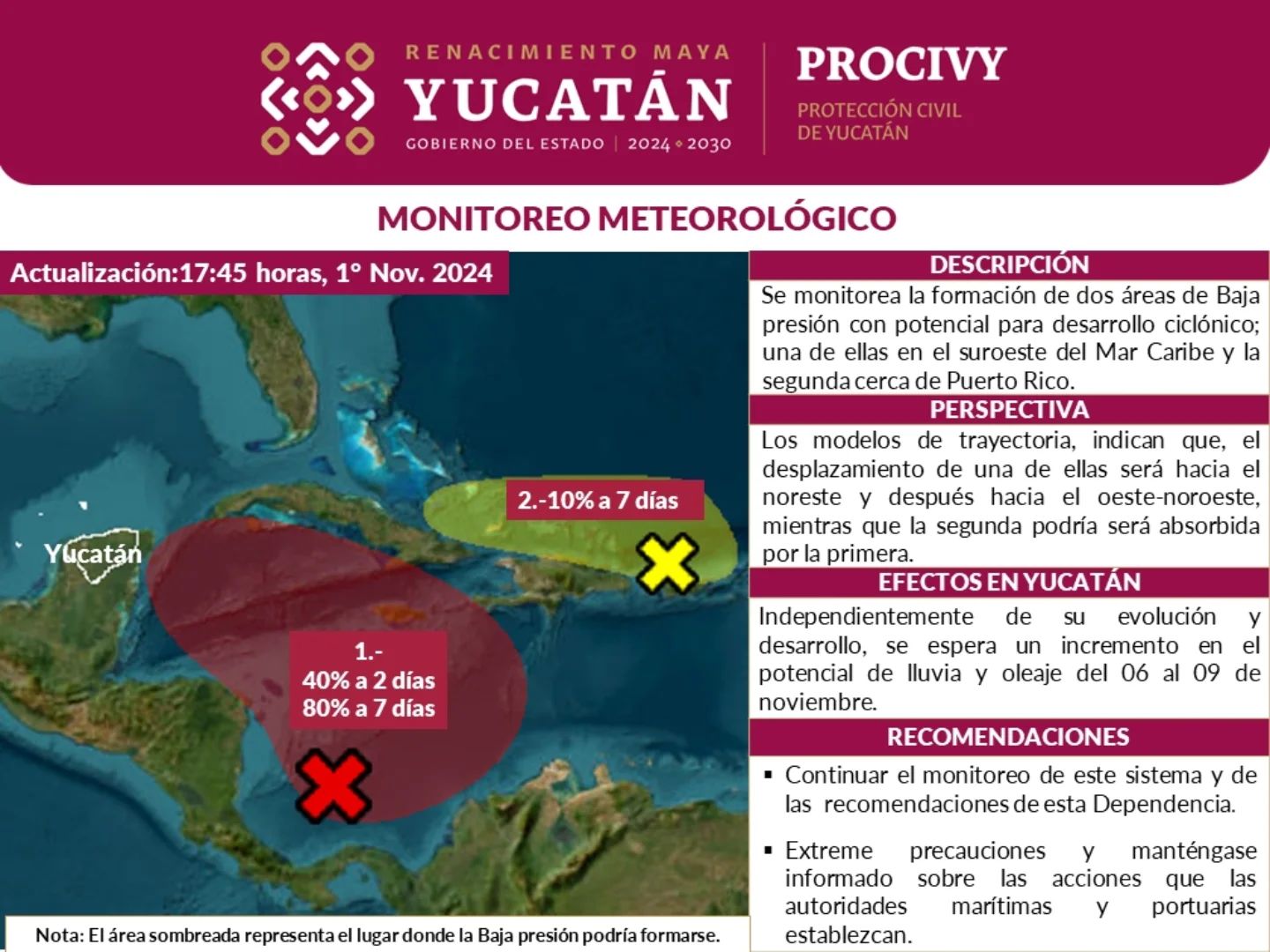 La Coordinación de Protección Civil en Yucatán informó que continúa el monitoreo de dos áreas de baja presión en el Atlántico que podrían afectar las condiciones meteorológicas en el estado en los próximos días.