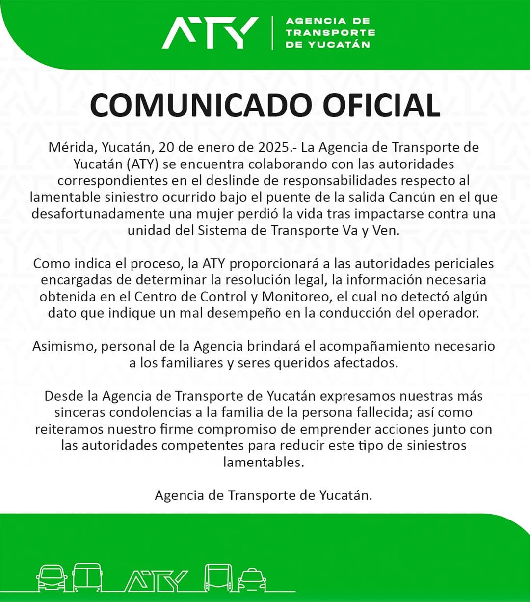 En un accidente ocurrido ayer 20 de enero, bajo el puente de la salida Cancún, en la ciudad de Mérida, una mujer perdió la vida tras ser impactada por una unidad del transporte público Va y Ven.