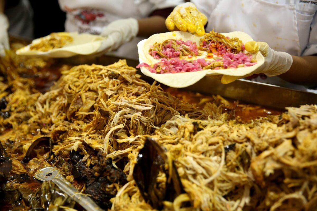 Originaria de la Península de Yucatán, la cochinita pibil es un platillo ancestral maya que consiste en cerdo marinado con achiote, envuelto en hojas de plátano y horneado bajo tierra. Se desmenuza y se sirve con tortillas, cebolla morada encurtida y salsas.