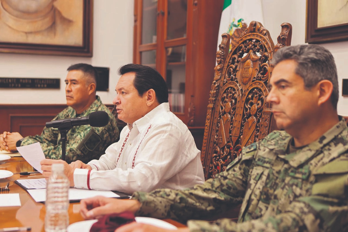 Acompañaron al gobernador los titulares de las Secretarías de Seguridad Pública (SSP), Luis Felipe Saidén Ojeda; de Gobierno, Omar Pérez Avilés; y de las Mujeres, Sisely Burgos Cano; así como el fiscal general del estado, Juan Manuel León León. También estuvieron presentes los comandantes de la 32ª Zona Militar, Bernardo Reyes Herrera, y de la X Región Militar, Ricardo Flores González. Asimismo, asistieron el coordinador estatal de la Guardia Nacional, Ramón Guardado Pérez, y el comandante de la Décimo Tercera Zona Naval, Héctor Solís Hernández.