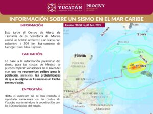 No se reportan afectaciones en las costas El Gobierno del Estado de Yucatán, a través de la Coordinación estatal de Protección Civil (Procivy), informa que la alerta de tsunami emitida por la Secretaría de Marina no representa peligro para la población. Esta advertencia se originó tras un sismo de 209 km al sur-suroeste de George … Sigue leyendo Alerta de tsunami en Yucatán: sin riesgo para la población