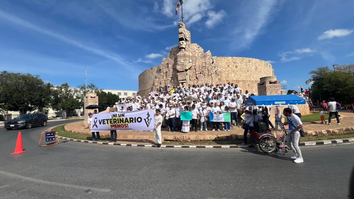 Un grupo de médicos veterinarios, acompañados de sus familias y mascotas, realizó una protesta en el Monumento a la Patria, en el corazón del Paseo de Montejo, para exigir respeto a su profesión y poner un alto a la criminalización y los ataques de violencia contra los miembros de este gremio.