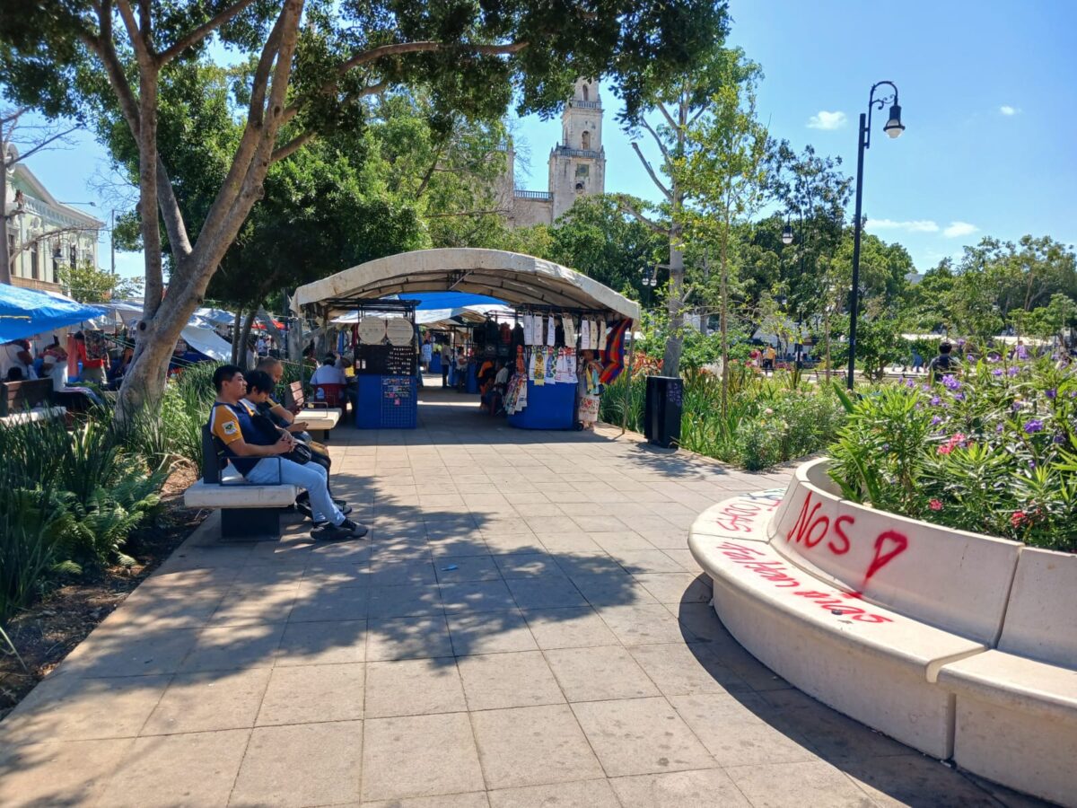 Familias y turistas que acudieron a la plaza grande de Mérida se encontraron con pintas y carteles, los cuales leían al llamarles la atención, pero también con un lugar ya de libre acceso y sin rastros de algunos destrozos ocasionados por la manifestación.