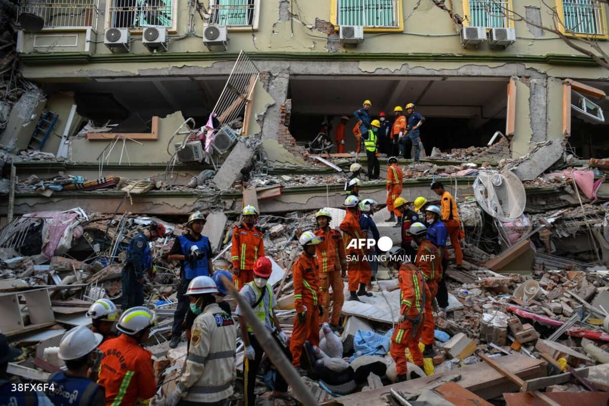 Rescue teams work to evacuate residents trapped under the rubble of the collapsed building 'Sky Villa Condominium development' in Mandalay on March 30, 2025. (Photo by Sai Aung MAIN / AFP)