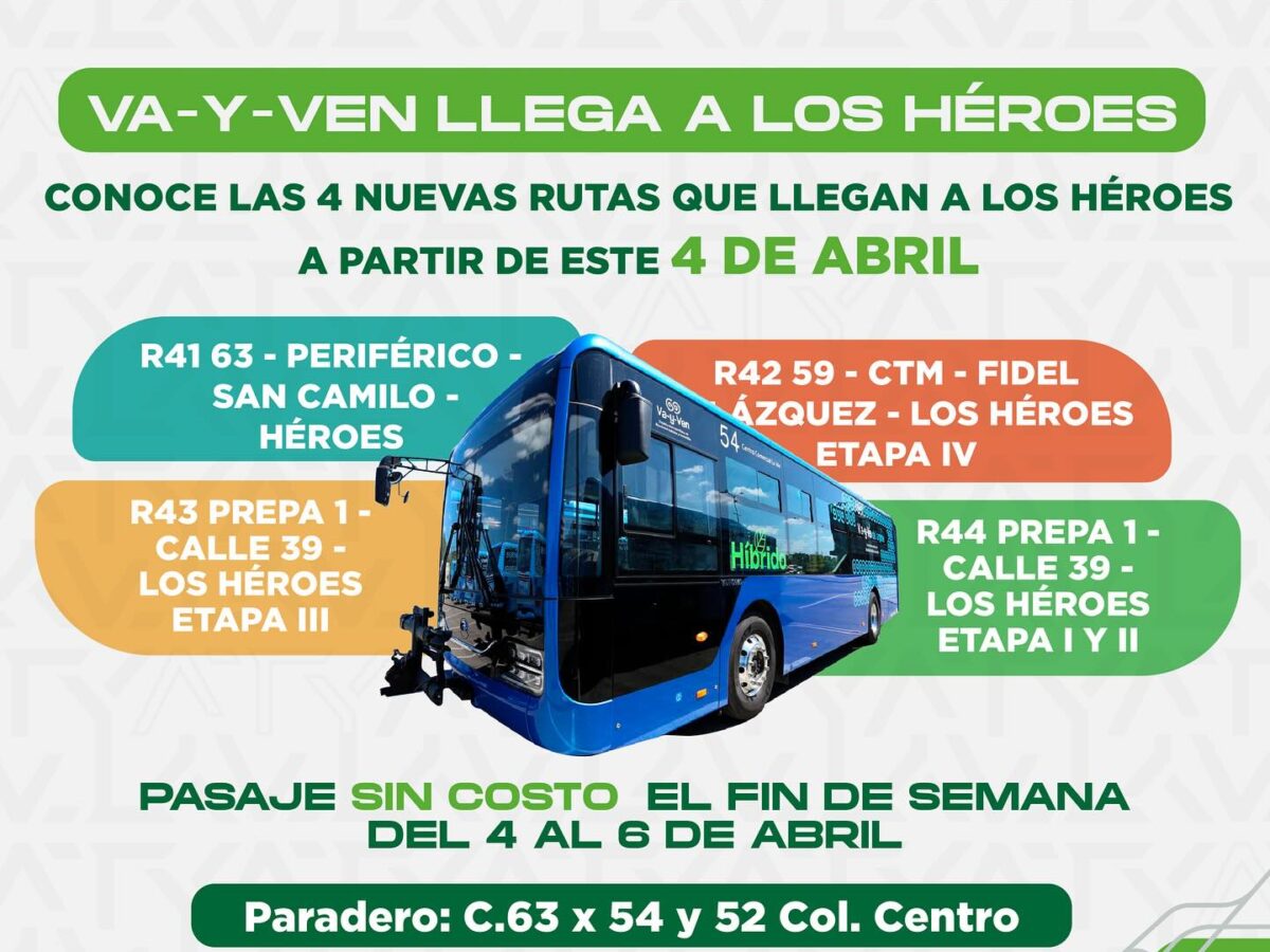 ¡Únete a nuestro canal de WhatsApp! La Agencia de Transporte de Yucatán (ATY) anunció que el viernes 4 de abril iniciarán operaciones 4 nuevas rutas del sistema de transporte público Va y Ven en el fraccionamiento Los Héroes. Este servicio busca mejorar la movilidad en el oriente de Mérida, brindando mayor conectividad y comodidad para … Sigue leyendo Va y Ven llega al Fraccionamiento Los Héroes con 4 nuevas rutas