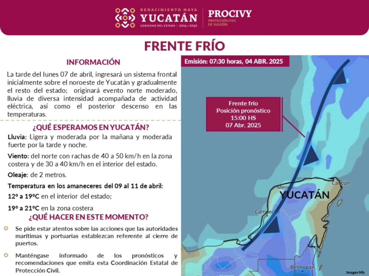 La Coordinación Estatal de Protección Civil de Yucatán (Procivy) informó que la tarde del lunes 7 de abril ingresará un frente frío sobre el noroeste de Yucatán, el cual se desplazará gradualmente por todo el estado.