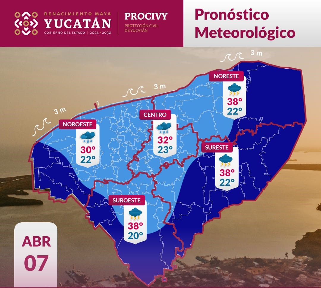 Este lunes 7 de abril, el Frente Frío número 37 ingresará a la península de Yucatán entre las 13:00 y 15:00 horas, generando un evento norte con incremento en el oleaje y lluvias de intensidad moderada en el noroeste y centro del estado. Durante las primeras horas del día, el ambiente será muy caluroso, con temperaturas que oscilarán entre los 30 y 38 grados Celsius.