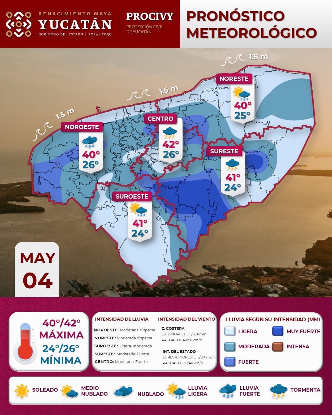 Este domingo 4 de mayo se espera lluvia dispersa en Yucatán, acompañada de altas temperaturas, fuertes rachas de viento y tormentas eléctricas. Las condiciones climáticas pueden variar en diferentes zonas del estado, por lo que es importante mantenerse informado.