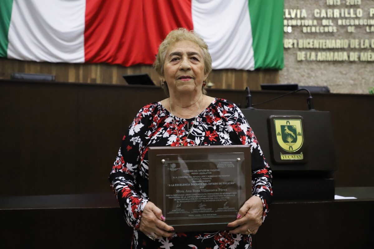 La maestra Ana Rosa Villanueva Pérez, quien por más de 64 años se ha destacado en el ámbito de la enseñanza y cuya trayectoria ejemplar ha sido sobresaliente en el impulso y desarrollo de la educación, fue reconocida por las y los diputados de la LXIV Legislatura, al entregarle el mérito a la “Excelencia Docente del Estado de Yucatán 2025”.