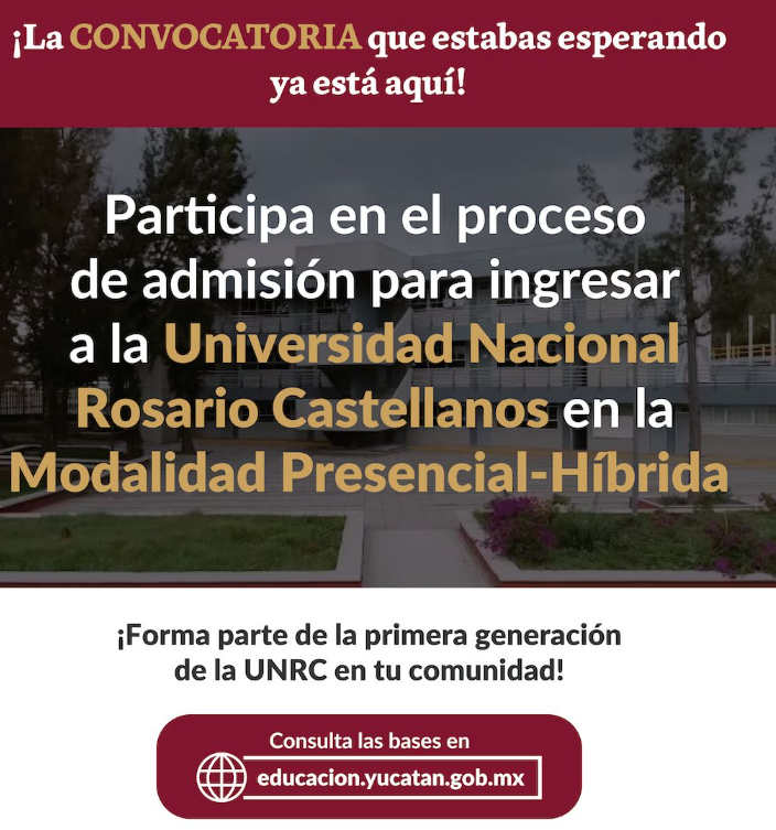 La Universidad Nacional Rosario Castellanos (UNRC), Unidad Académica Kanasín, Yucatán, abrió su convocatoria 2025-2 para estudios de licenciatura en modalidad presencial-híbrida, ofreciendo un total de 1,080 lugares.