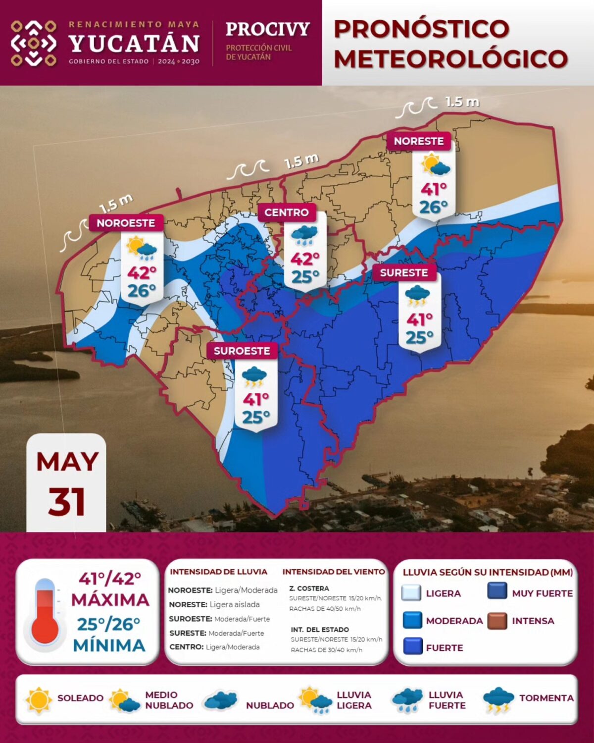 Para este sábado 31 de mayo, se espera #Lluvia de intensidad moderada a fuerte acompañada de rachas de viento y actividad eléctrica en los municipios de #Yaxcabá, #Peto, #Tekit, #Sotuta, #Tekax, #Homún, #Valladolid y aledaños, la cual, se registrará hacia el final de la tarde y por la noche.