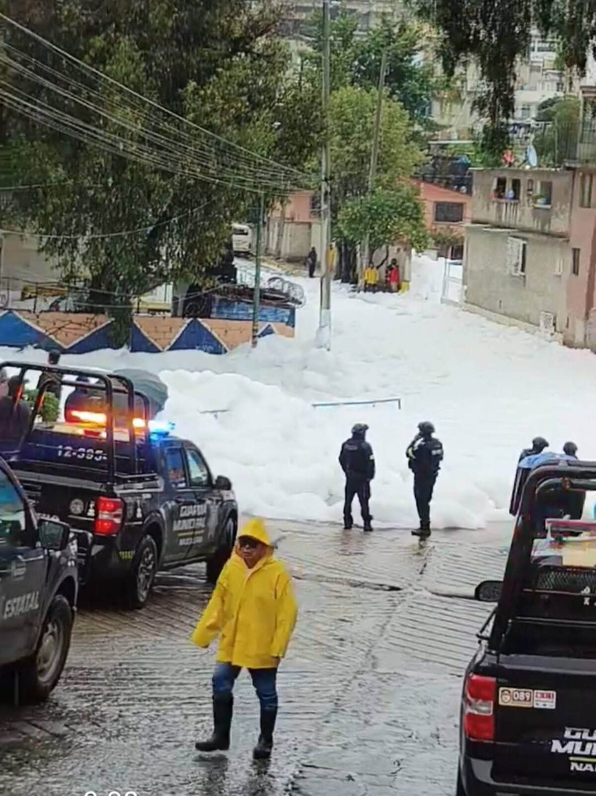 Brigadas del Grupo Tláloc y Protección Civil del Estado de México realizaron trabajos de desazolve en la colonia San Rafael Chamapa, en Naucalpan, luego de que una sustancia espumosa blanca, identificada como tóxica, inundara casas y calles del área.