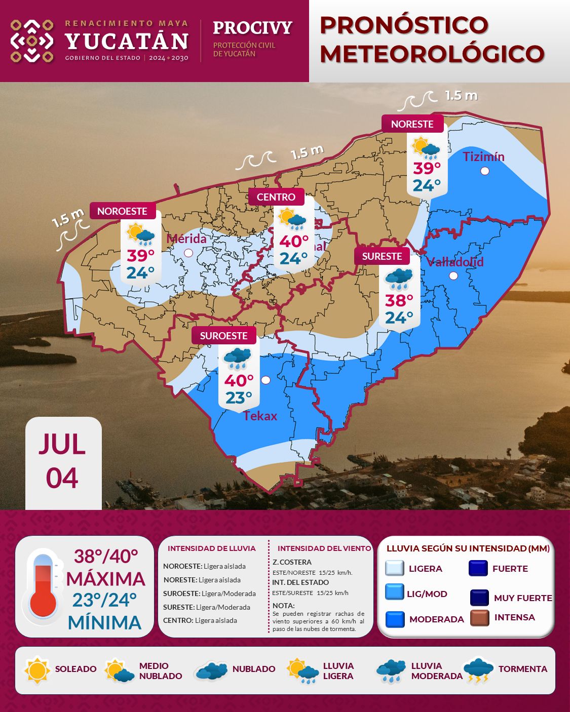 De acuerdo con la Protección Civil Yucatán, se esperan lluvias moderadas dispersas acompañadas de rachas de viento y actividad eléctrica en los municipios del noreste, centro y sur del estado para el viernes 04 de julio. En el noroeste, las lluvias serán de intensidad ligera y aislada.
