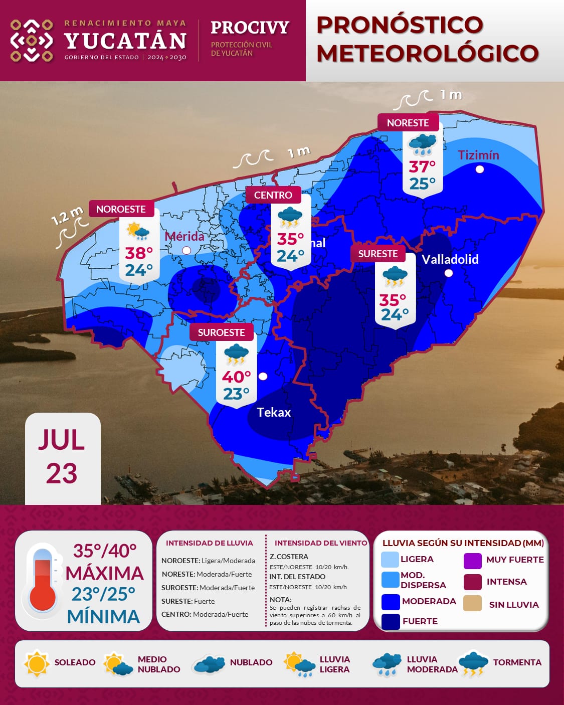 El ambiente será muy caluroso, con temperaturas máximas de entre 35 y 38 °C en municipios como Tizimín, Valladolid, Izamal y Mérida. En la región de Tekax, el termómetro podría alcanzar hasta los 40 °C, mientras que en la zona costera las temperaturas se mantendrán entre los 30 y 32 °C.