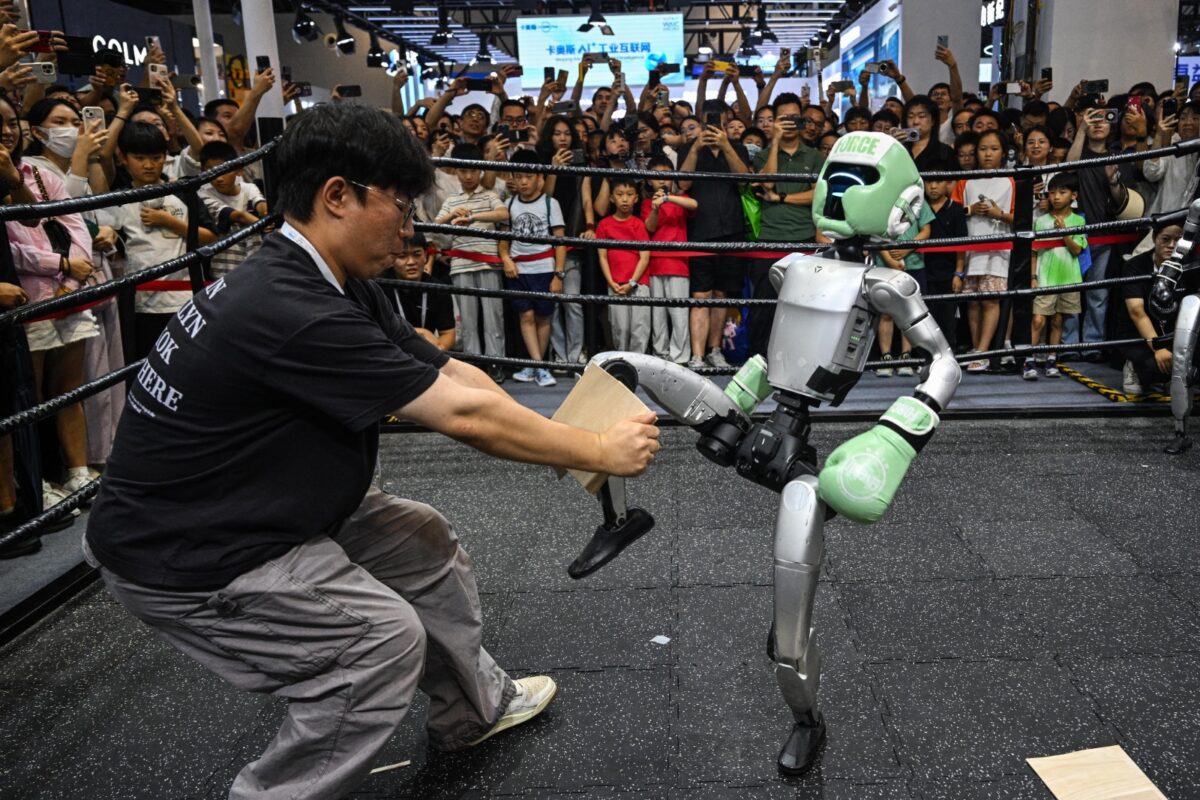 Entre los robots que más llamaron la atención está el androide G1 de Unitree, que puede patear, girar y mantener el equilibrio mientras boxea sobre un ring.