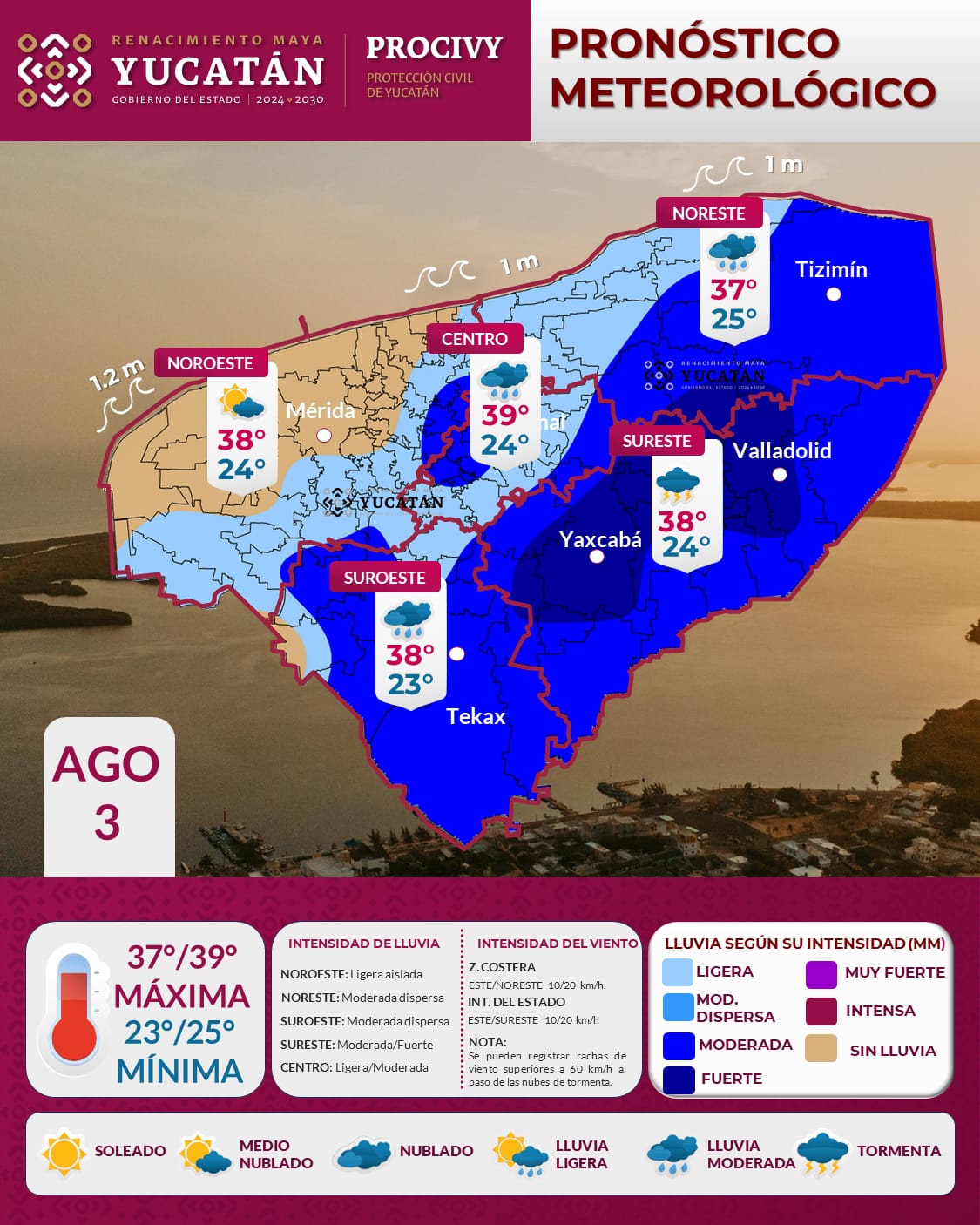 Pronóstico de este domingo 3 de agosto, el ingreso de aire marítimo tropical y una vaguada provocarán lluvias de moderadas a fuertes en municipios del noreste, centro y suroeste de Yucatán.