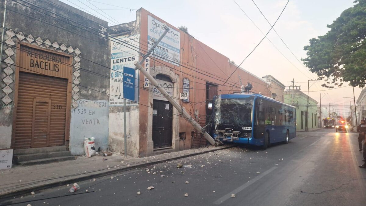 Transporte público: La Policía Municipal de Mérida atendió este domingo un accidente de tránsito en la calle 67 entre 64 y 62, donde un autobús de transporte público con número económico CS-044, conducido por José H.A.M.S., colisionó contra un poste de la Comisión Federal de Electricidad (CFE), quebrando su estructura.