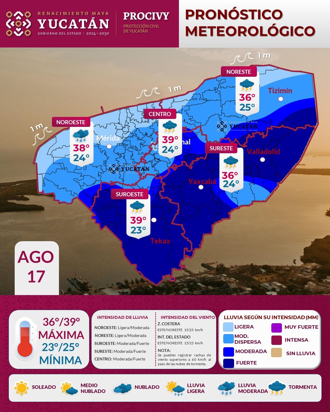 En el sureste y suroeste del estado se prevén lluvias de moderada a fuerte intensidad, con actividad eléctrica y rachas de viento entre las 14:00 y 18:00 horas.