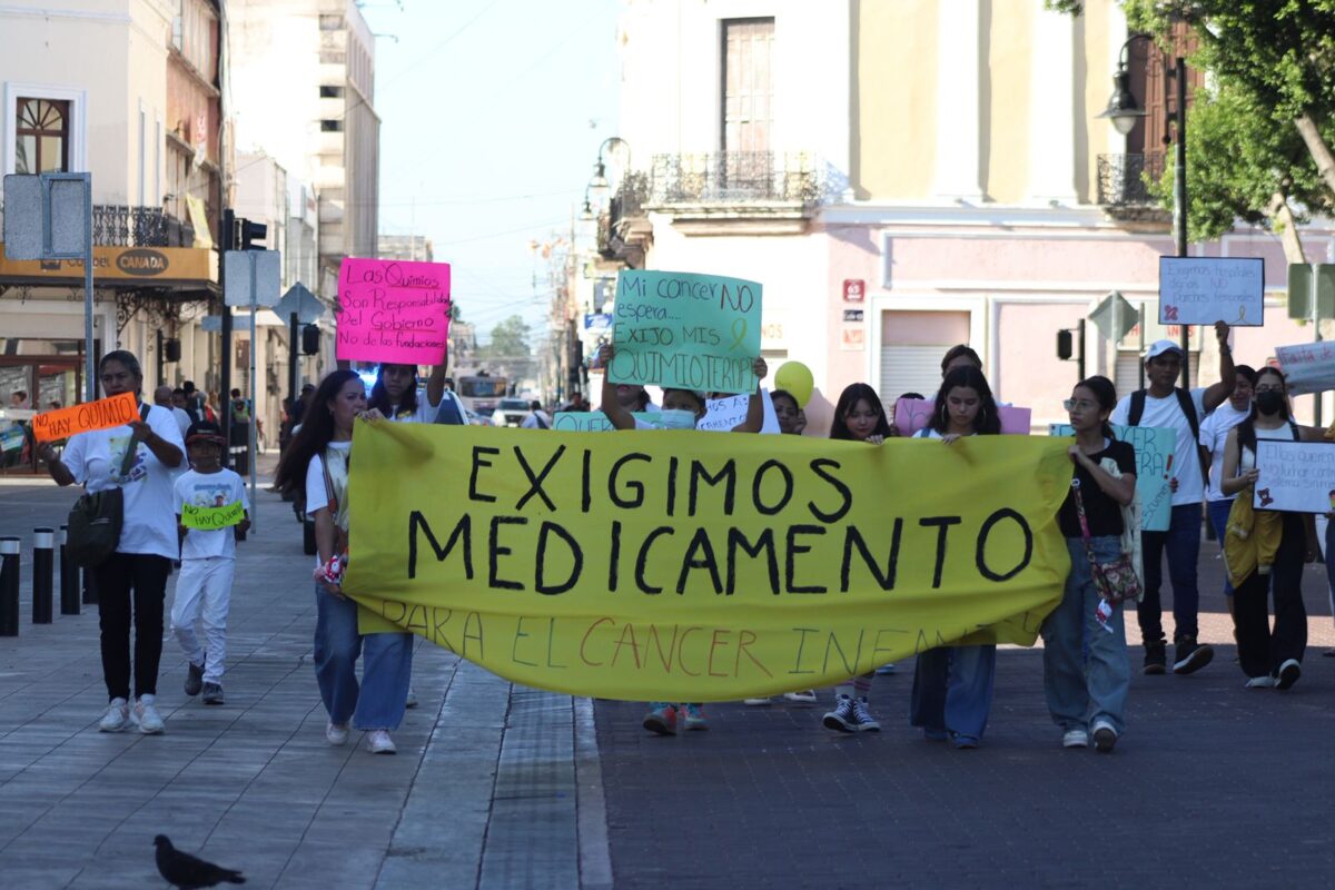 Con pancartas y consignas, los padres exigieron a las autoridades garantizar un abasto continuo de medicinas y una atención digna para los niños con cáncer en Yucatán.