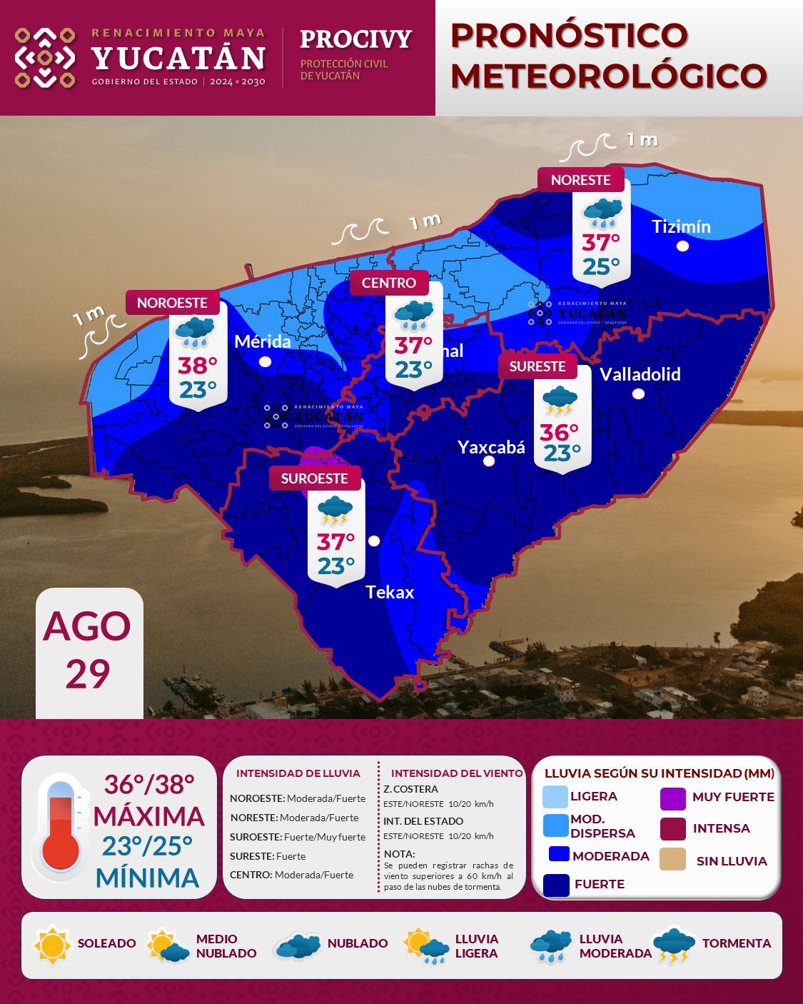 Para este viernes 29 de agosto, el ingreso de aire marítimo tropical procedente del Mar Caribe y del Golfo de México, favorecerá la presencia de lluvia ligera dispersa por la mañana en algunos municipios de Yucatán; a partir de las 13:00 horas se registrará de intensidad moderada a fuerte en municipios del noreste y noroeste; y entre las 14:00 y 18:00 horas se espera de intensidad fuerte ocasionalmente muy fuerte en los municipios del sureste, centro y suroeste.