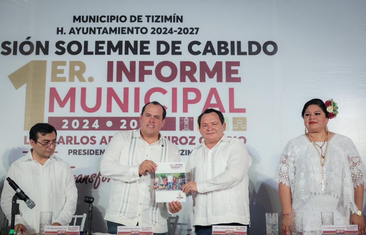 El Gobernador Joaquín Díaz Mena ratificó el trabajo coordinado con el Ayuntamiento de Tizimín durante el primer informe de gobierno del alcalde Adrián Quiroz Osorio, destacando acciones en seguridad, salud, infraestructura y apoyo al campo.