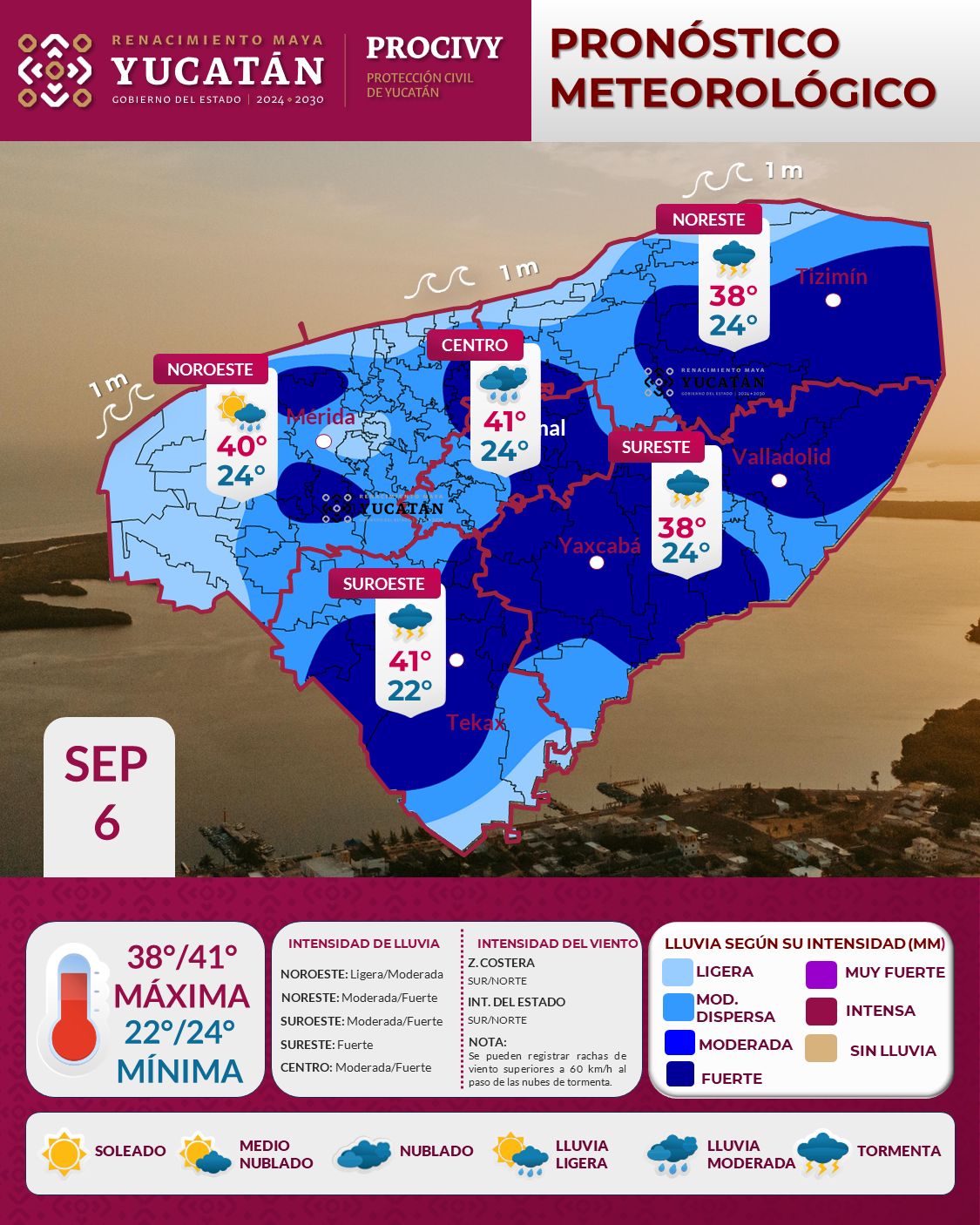 Para este sábado 6 de septiembre, el ingreso de aire marítimo tropical procedente del Mar Caribe y del Golfo de México, así como del establecimiento de una vaguada, favorecerán la presencia de lluvia dispersa después de las 13:00 horas en municipios del noreste y noroeste de Yucatán, incrementándose a moderada y fuerte acompañada de rachas de viento y actividad eléctrica después de las 15:00 horas, sobre todo en municipios del noreste, sureste, centro y suroeste.