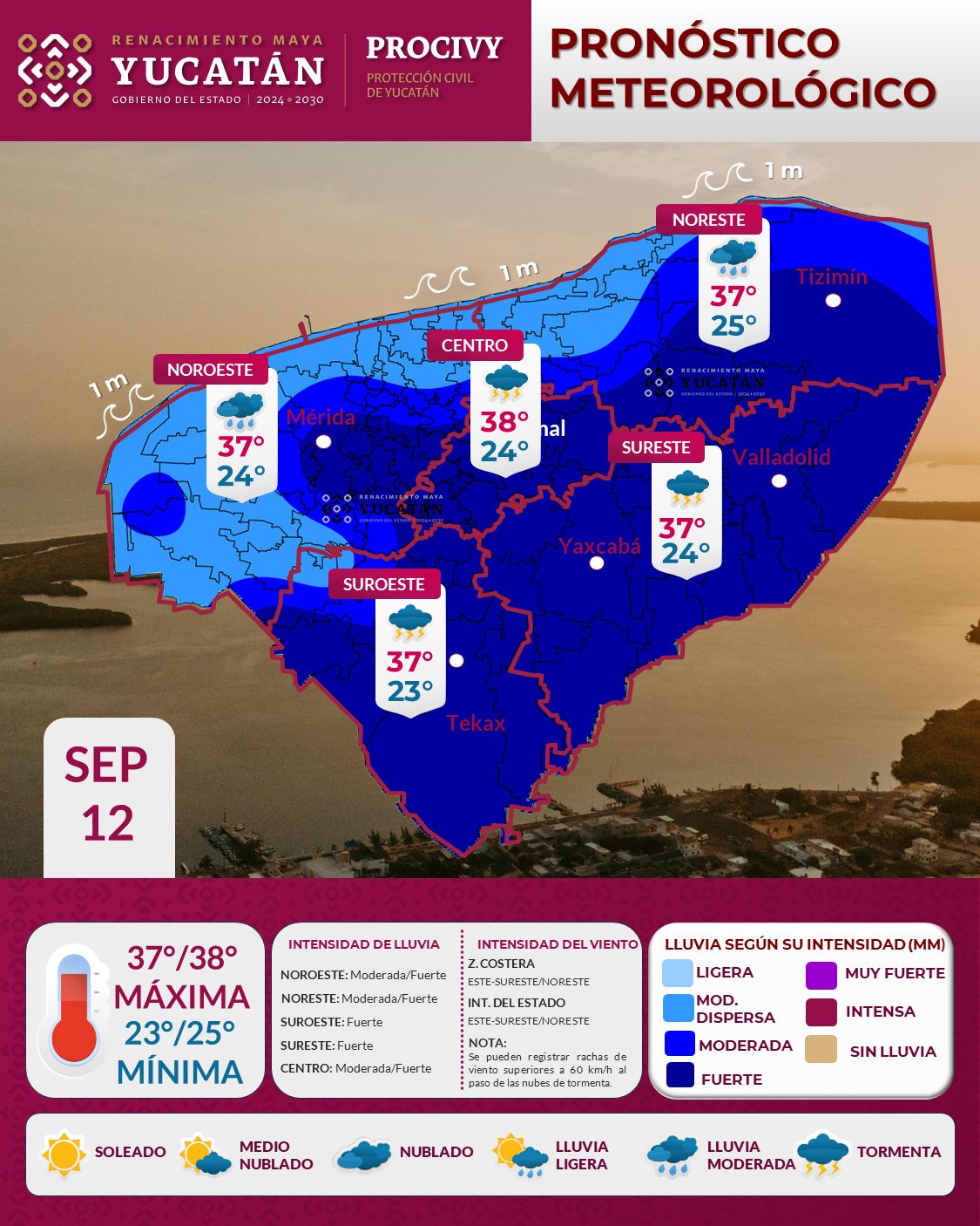 Para este viernes 12 de septiembre, debido al ingreso de humedad proveniente del Mar Caribe y del Golfo de México, así como por el establecimiento e influencia de vaguadas, continuará la presencia de lluvia moderada y fuerte acompañada de rachas de viento y actividad eléctrica a partir del mediodía en los municipios del noreste y noroeste; y de manera gradual, en el centro, sureste y suroeste de Yucatán.