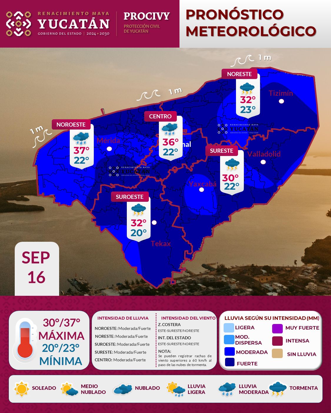 Para este martes 16 de septiembre, debido al ingreso de aire marítimo tropical procedente del Mar Caribe, la cercanía de una Onda Tropical, así como inestabilidad atmosférica superior, se espera lluvia moderada y fuerte acompañada de rachas de viento y actividad eléctrica entre las 9:00 horas y el mediodía en municipios del noreste y sureste de Yucatán; y después del mediodía y hacia el final de la tarde en municipios del centro, suroeste y noroeste.