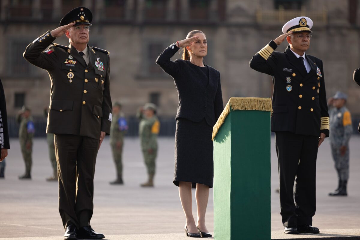 Acompañaron a la mandataria: la secretaria de Gobernación, Rosa Icela Rodríguez Velázquez; los secretarios de Seguridad y Protección Ciudadana, Omar García Harfuch, Defensa Nacional, Ricardo Trevilla Trejo, y Marina, Raymundo Pedro Morales Ángeles.