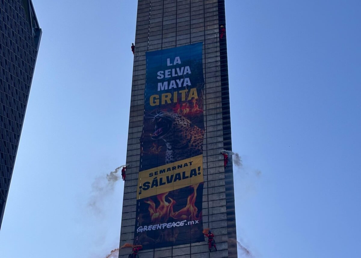 Nueve integrantes escalaron los 104 metros de la Estela de Luz, en Paseo de la Reforma, Ciudad de México, mientras otros desplegaban una manta con el mensaje: “Selva Maya grita, Semarnat sálvala”.