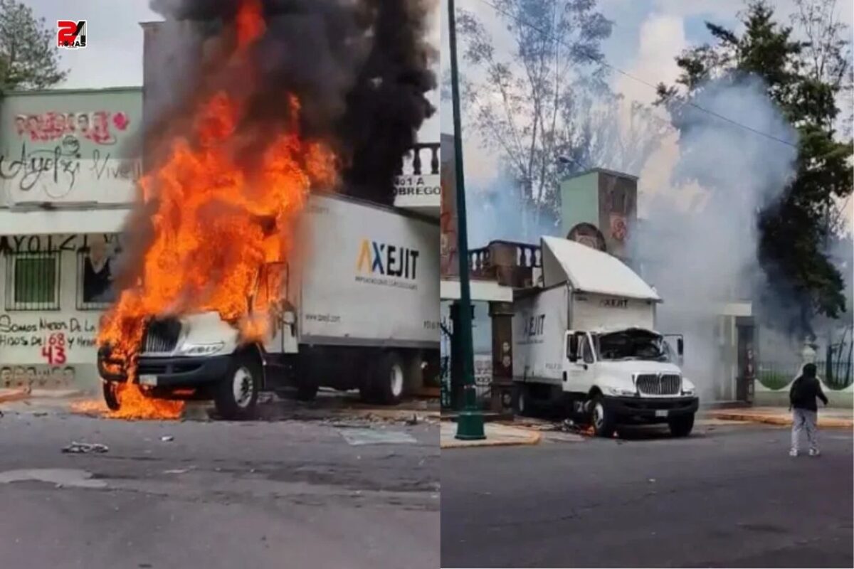 En un momento, los manifestantes tomaron un vehículo de carga, bajaron al chofer y lo empujaron en reversa contra la reja de entrada del Campo Militar. Segundos después, un petardo explotó dentro de la cabina, provocando que el camión, propiedad de la empresa Axejit, se incendiara.