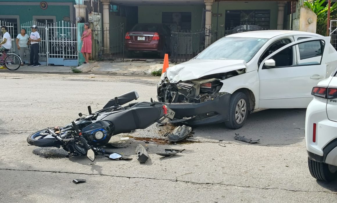 Según datos obtenidos, el conductor de un Volkswagen Gol circulaba sobre la calle 39-C de poniente a oriente y, al intentar incorporarse a la calle 2-B de la colonia Mayapán, no advirtió que de frente venía una motocicleta, provocando el fuerte choque.