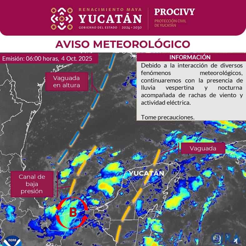 Para este sábado 4 de octubre, debido a la influencia de una vaguada en altura, el aporte de humedad que genera un canal de Baja Presión localizado sobre sur del Golfo de México y su interacción con el establecimiento de una vaguada sobre la Península de Yucatán, se espera lluvia moderada y ocasionalmente muy fuerte sobre #Yucatán; al principio se registrará en los municipios del noreste y de manera gradual en municipios del centro, noroeste, sureste y suroeste.