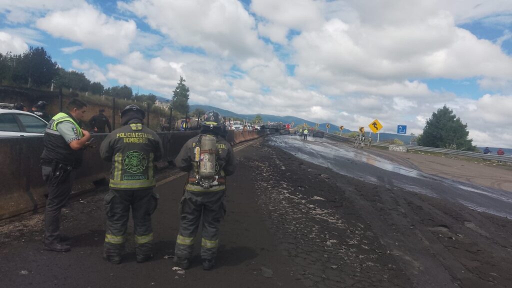 Cerca del mediodía, CAPUFE reportó que continuaban las labores de atención por la volcadura e incendio del tractocamión tipo pipa que transportaba combustóleo.