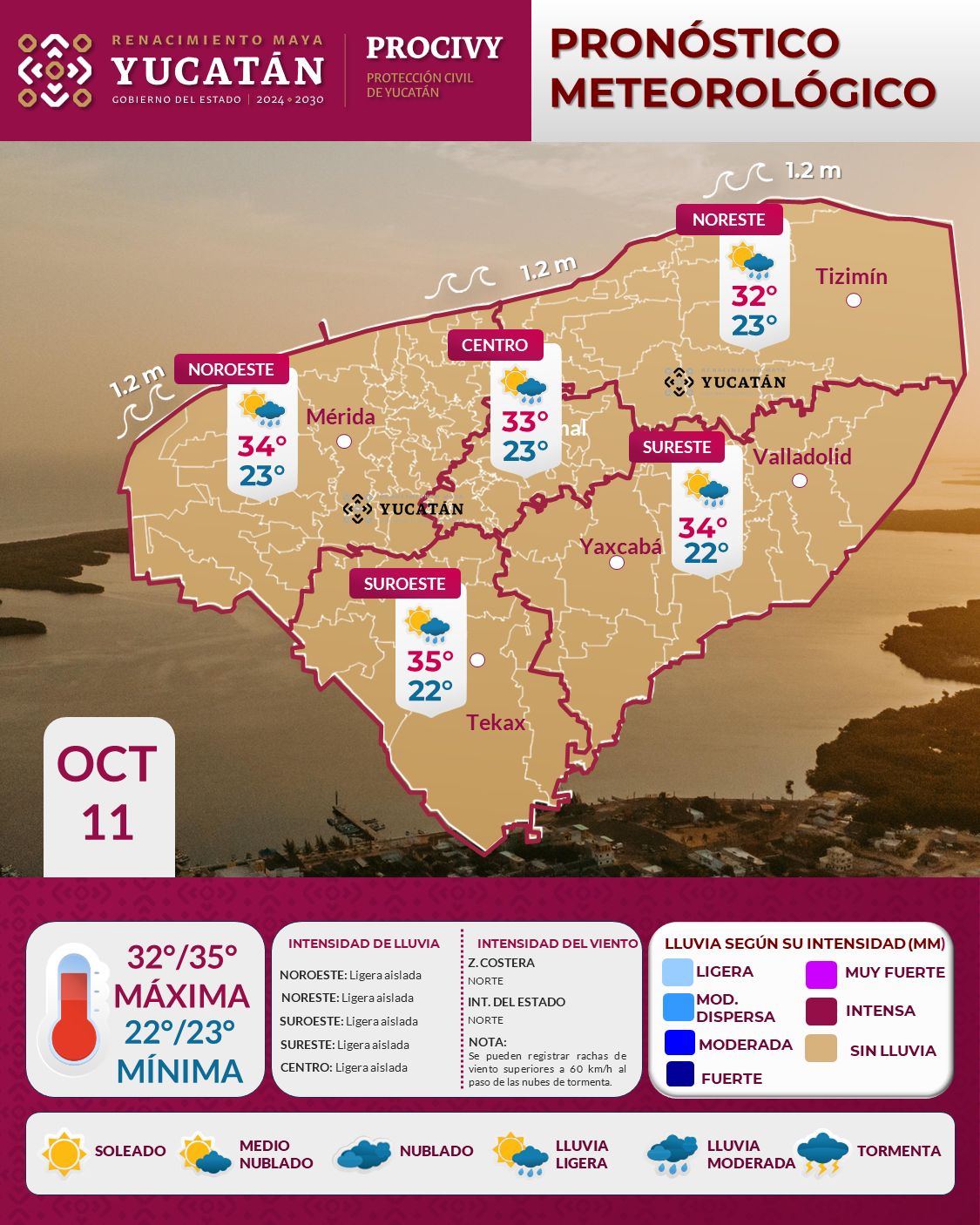 Para este sábado 11 de octubre, debido al ingreso de aire marítimo procedente del Golfo de México, en Yucatán se espera ambiente cálido a caluroso en el día, con temperatura máxima de 32 a 35°C en el interior del estado y de 29° a 31°C en el litoral yucateco.