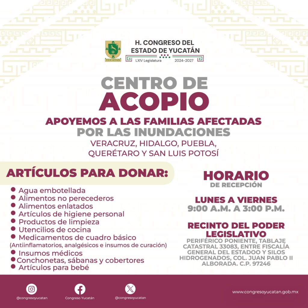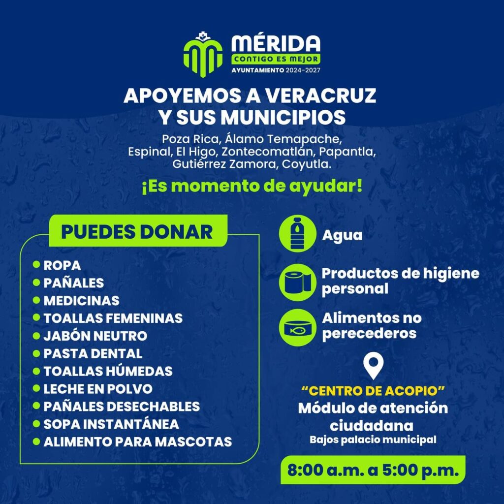 Finalmente, el Ayuntamiento de Mérida instaló su "CENTRO DE ACOPIO" en el Módulo de atención ciudadana, bajos del palacio municipal (calle 62 por 61 y 63 centro), disponible de 8:00 a.m. a 5:00 p.m. para recibir la ayuda.