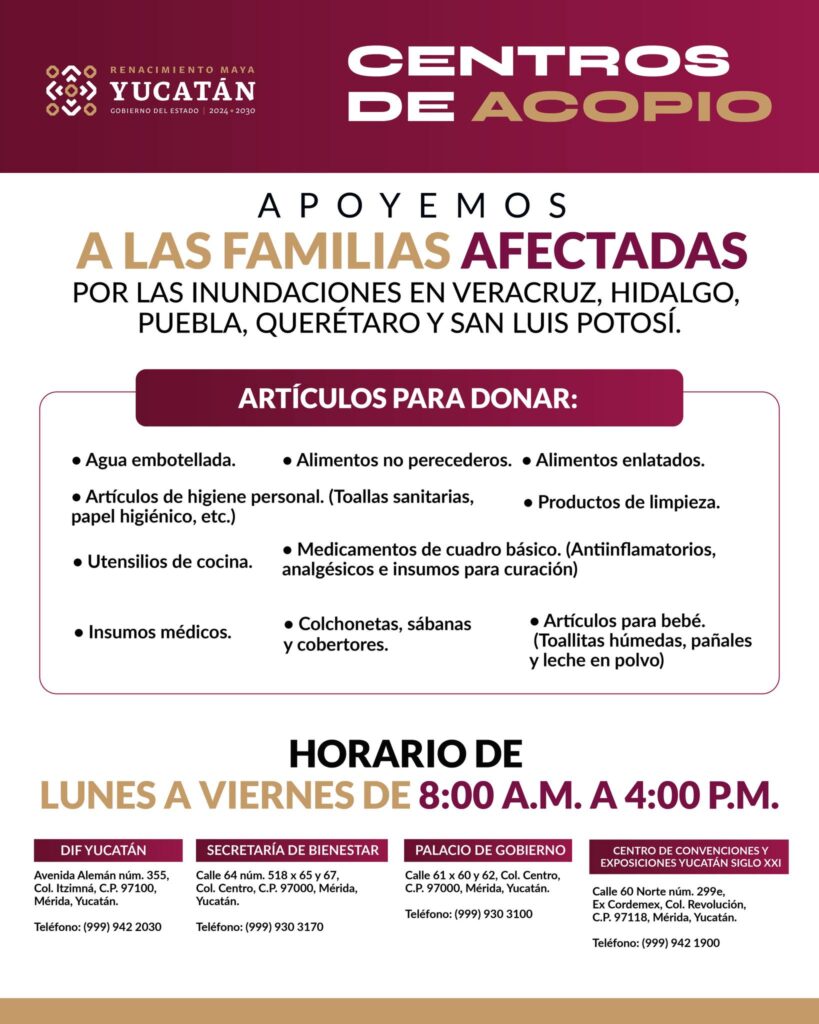 El Gobierno del Estado, a través de sedes como el DIF Yucatán (Avenida Alemán #355 Col. Itzimná), la Secretaría de Bienestar (calle 64 #518 por 65 y 67 centro), el Palacio de Gobierno y el Centro de Convenciones Yucatán Siglo XXI, recibe las donativos de lunes a viernes en un horario amplio de 8:00 A.M. a 4:00 P.M.
