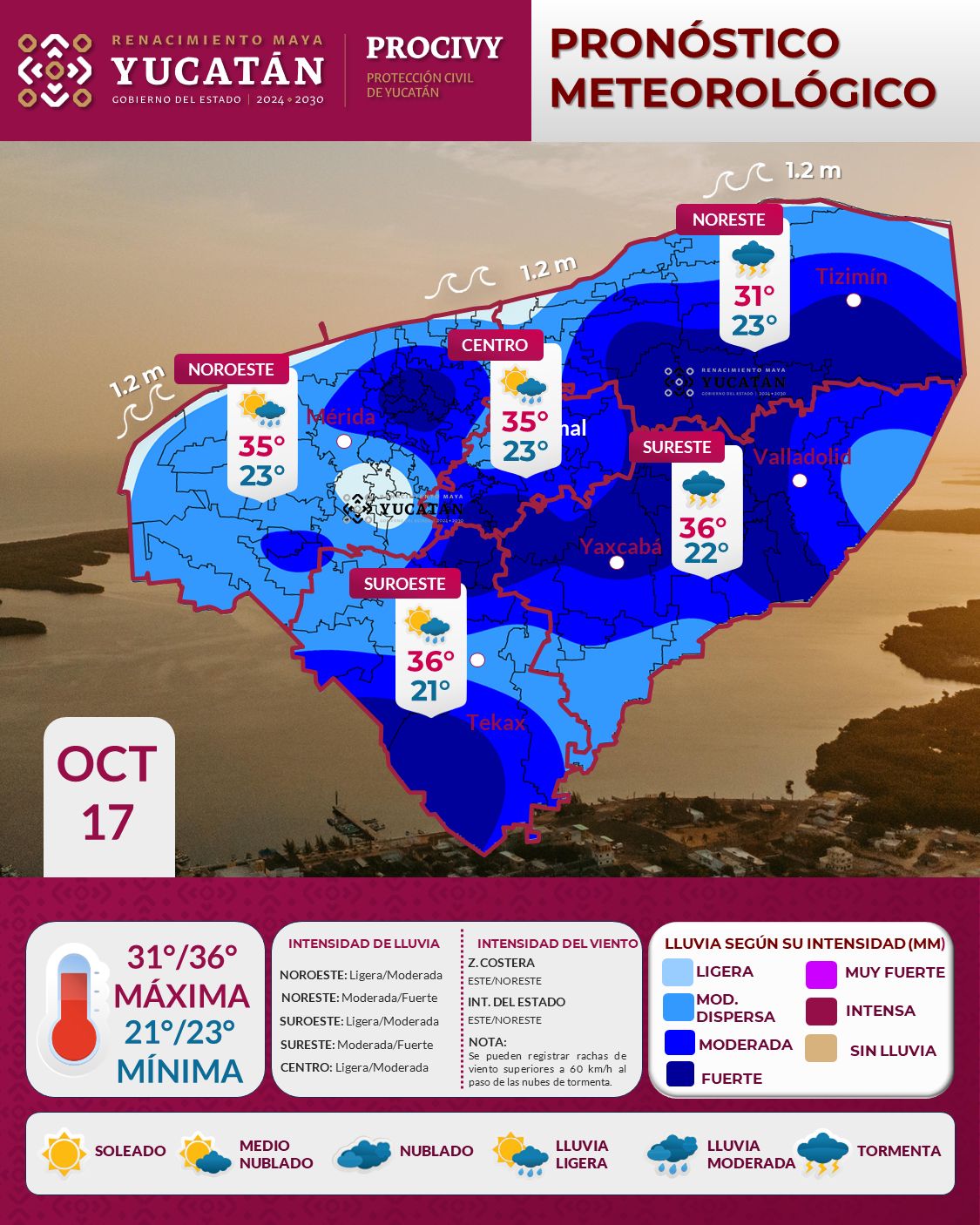 Para este viernes 17 de octubre, debido al ingreso de aire marítimo tropical y el establecimiento de una vaguada, se espera lluvia ligera aislada poco antes del mediodía en algunos municipios de Yucatán; y después de las 13:00 horas, se registrará de intensidad moderada y fuerte acompañada de rachas de viento y potencial de actividad eléctrica; al principio en municipios del noreste y sureste, como Tizimín, Valladolid y aledaños, mientras que, después de las 14:00 horas, se registrará en regiones comprendidas en Izamal, Tekax, Mérida y alrededores.
